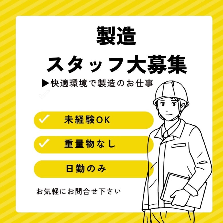 残業:20~45時間/月 程度あり【オススメポイント】◆◆◆◆◆◆◆ ◇ しっかり稼げる ◇ ◇ 高収入!25~30万可! ◇ ◇ 常日勤でプライベート充実 ◇ ◇ 社員登用実績アリ! ◇ ◇ 食堂あり ◇ ◇ 作業着通勤OK! ◇ ◇ 社会保険完備 ◇ […] -